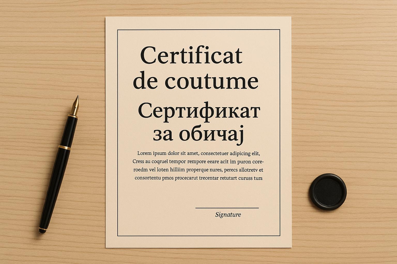 Certificat de coutume или Сертификат за обичај е официјален правен документ кој дава објаснување за важечките закони и обичаи на Република Северна Македонија.